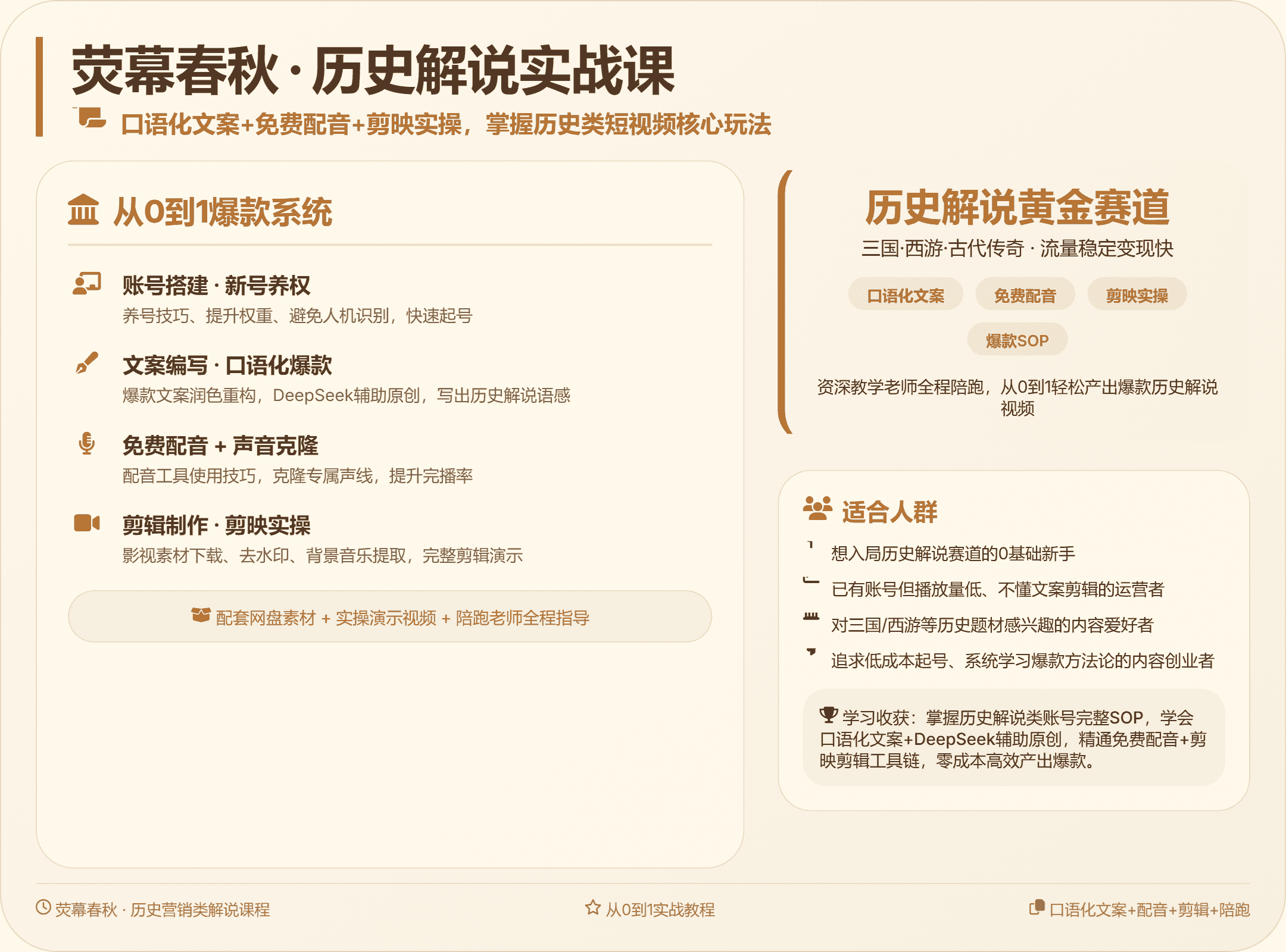 1. 掌握历史解说类账号从搭建到爆款的完整SOP,独立产出高质量视频。