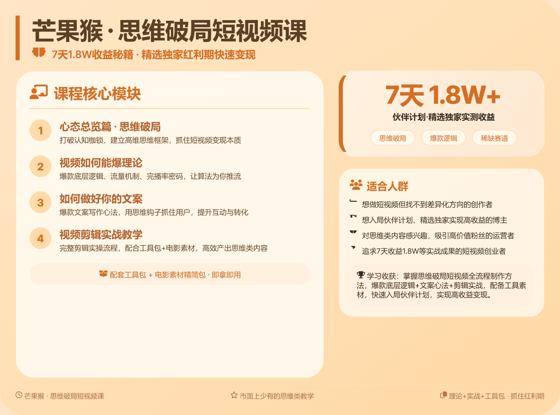 【21472】芒果猴思维破局短视频课:7天1.8W收益秘籍:市面上少有的思维类教学,抓住精选独家红利期快速变现