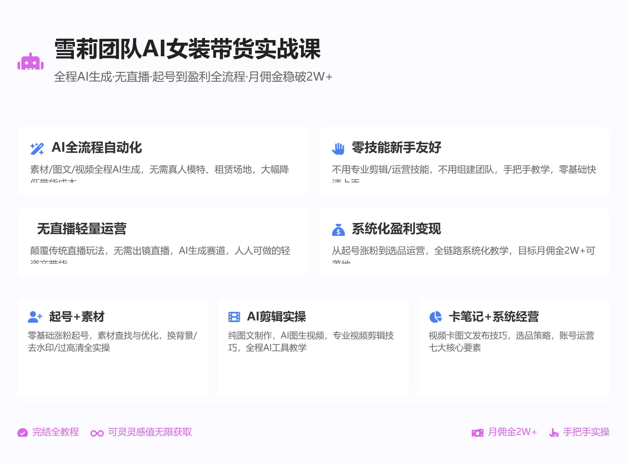 想做女装带货却被这些难题困住?请真人模特、租拍摄场地成本太高,自己不会拍素材、剪视频,起号半天没流量,商品卡没人点,佣金賺得寥寥无几?这款AI女装带货实战课彻底颠覆传统玩法,从起号定位到素材生成、图文视频剪辑,再到商品卡优化和系统经营,全程AI自动化操作,不用专业技能、不用组建团队,新手也能快速上手,轻松实现月佣金2W+!